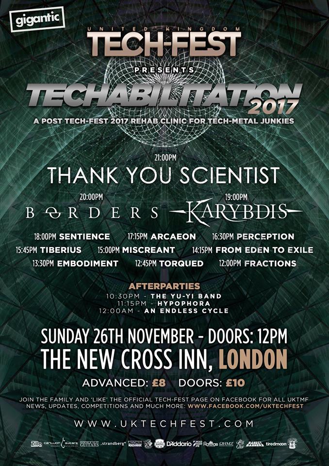 Running from 12 noon until late the lineup has been announced as Thank You Scientist, Borders, Karybdis, Sentience, Arcaeon, Perception, Tiberius, Miscreant, From Eden to Exile, Embodiment, Torqued and Fractions with after-party bands The Yu-yi Band, Hypophora and An Endless Cycle!